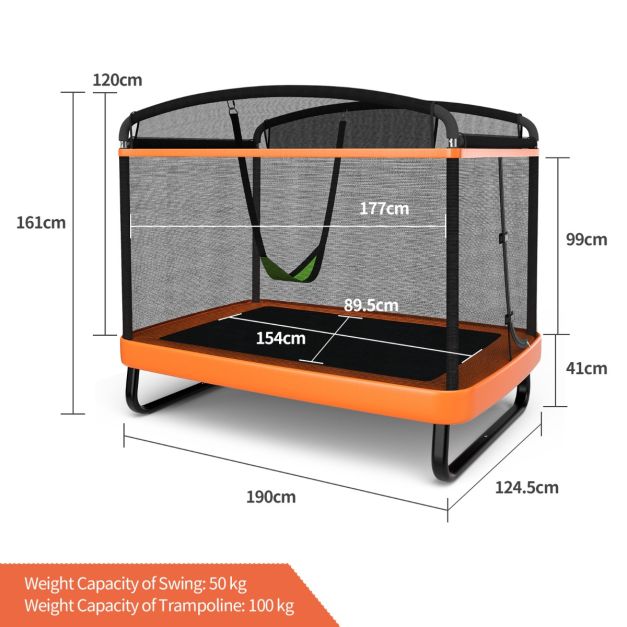 Sturdy Structure: Constructed of sturdy 2 U-shaped galvanized steel frames, this safe trampoline is anti-rust for outdoor use and stable for safety. Moreover, it comes with a strong loading capacity for different zones (100 kg for trampoline and 50 kg for swing).